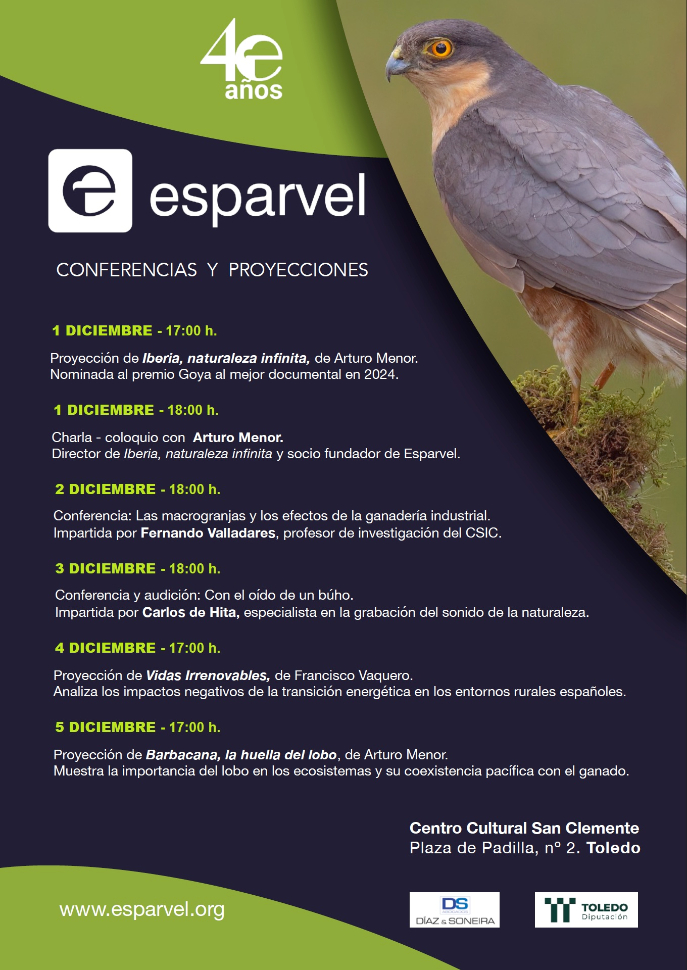 La Asociación Esparvel, entidad defensora de la naturaleza de Castilla-La Mancha, conmemora este trimestre su 40º aniversario con una programación especial de actividades abiertas al público que tendrá lugar en el Centro Cultural San Clemente, del lunes 1 al viernes 5 de diciembre.