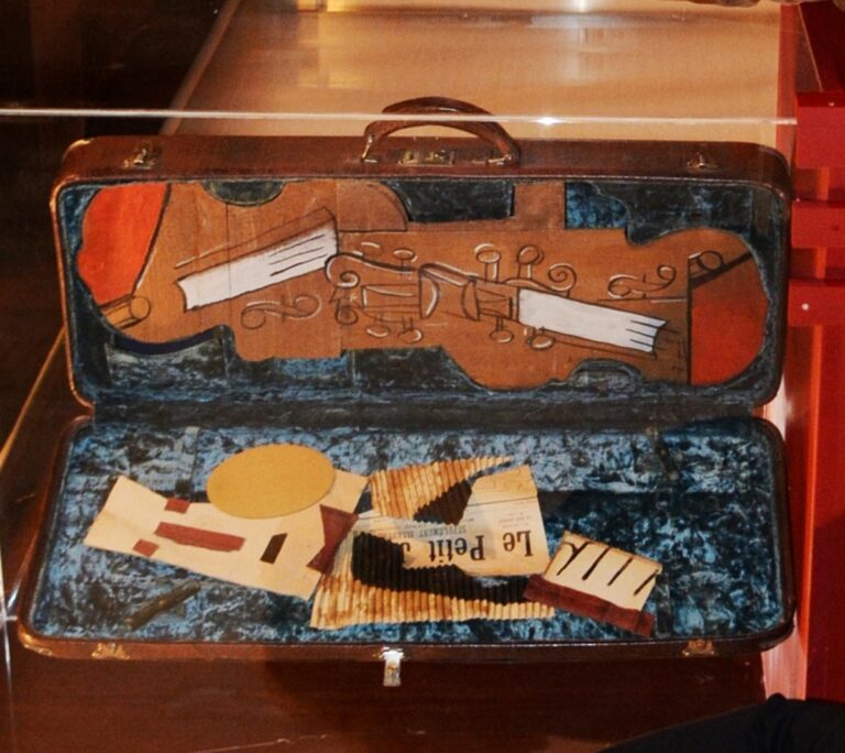 La obra en cuestión es un collage que ocupa las dos mitades de un estuche para dos violines, representando un violinista y el contorno de dos violines, realizados con madera de pino en el anverso y de álamo en el reverso, ambas sin barnizar y con el anverso pintado. Picasso usó estos tipos de maderas en varias esculturas como 'Naturaleza muerta' realizada en 1914.