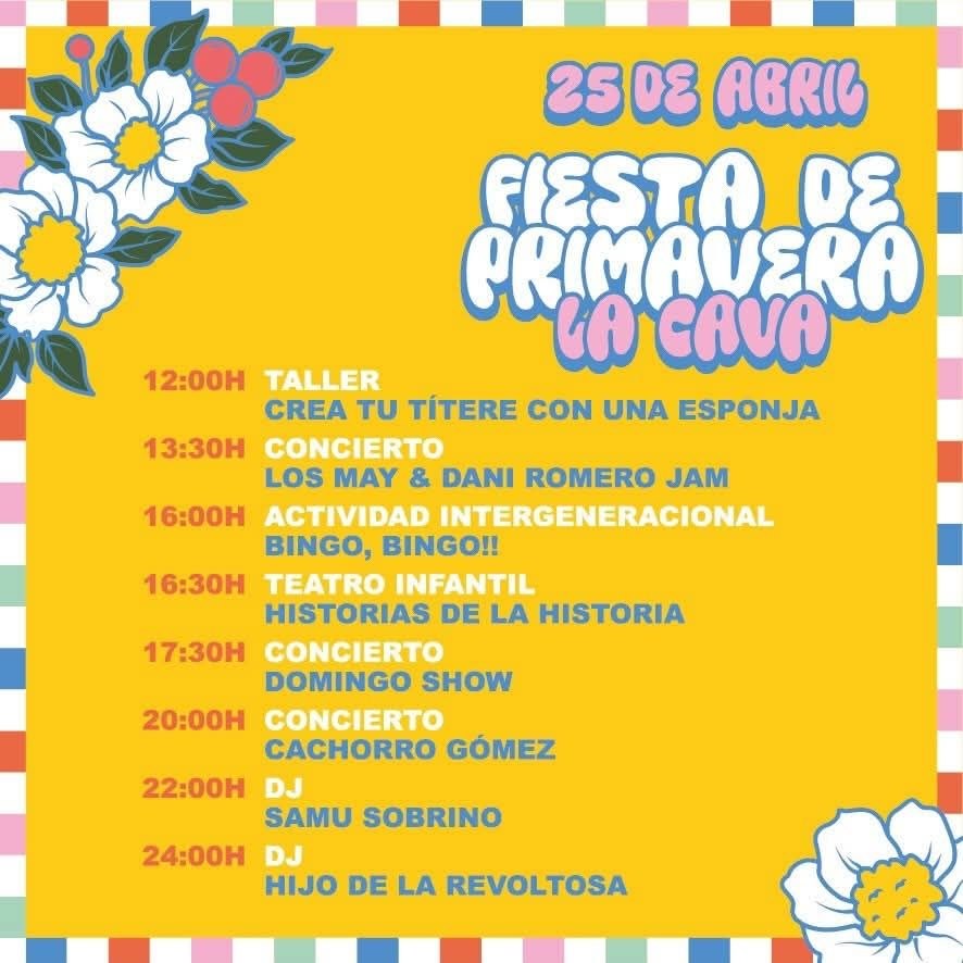 Localización Mirador de La Cava Categoría ConciertoTaller ir a la agenda Noticias Cultura Fecha sábado 25 Abr 2026 Hora Evento de todo el día Fiestas de Primavera La Cava Compartir este evento + Añadir Google Calendar Exportación + iCal / Outlook Etiquetas: fiesta primavera, La Cava