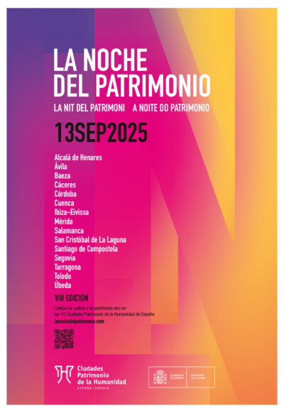 La Noche del Patrimonio es un evento cultural sin precedentes que se celebra de forma simultánea en las 15 Ciudades Patrimonio de la Humanidad de España. Durante una sola noche al año, sus centros históricos —todos ellos declarados Patrimonio Mundial por la UNESCO- se transforman en escenarios vivos donde confluyen el arte contemporáneo, la historia, la creatividad y la ciudadanía.