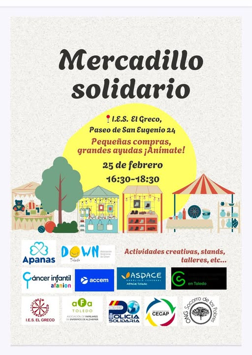 Leer más Localización IES El Greco P.º de San Eugenio, 23, 45003 Toledo Categoría Mercado Más Información Leer más ir a la agenda Noticias Cultura Fecha miércoles 25 Feb 2026 Hora 16:30 - 18:30 Mercadillo solidario en el IES El Greco Ver esta publicación en Instagram Una publicación compartida por Greco Toledo. Paseo de San Eugenio, 23-45003. 925223594. (@grecotoledoies) Compartir este evento + Añadir Google Calendar Exportación + iCal / Outlook