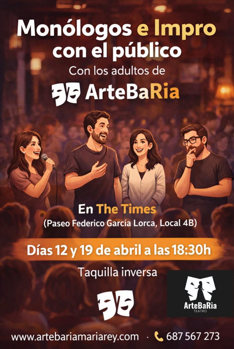 Los adultos de ArteBaRia llegan con una nueva propuesta. Monólogos e improvisación con el público. ¿Donde? En The Times (Paseo Federico García Lorca, Local 4B) los días 12 y 19 de abril a las 18:30h. Taquilla inversa: tú decides cuánto vale disfrutar del espectáculo.