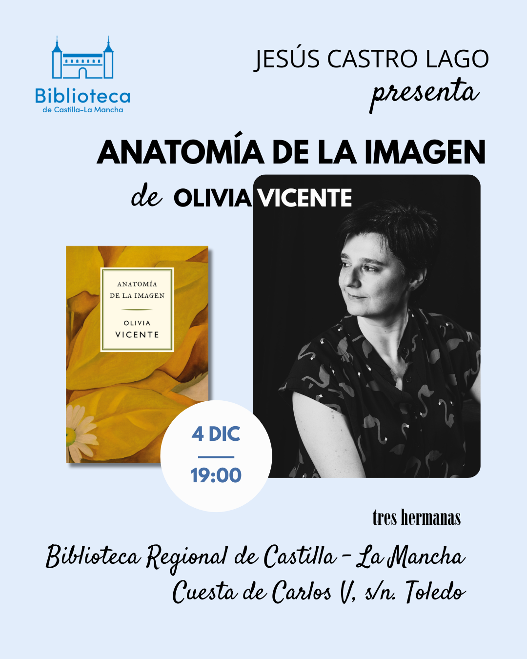 Localización Biblioteca de Castilla-La Mancha Cuesta Carlos V, 4, 45001 Toledo, España Categoría FotografíaLibrosLiteraturaPresentación ir a la agenda Noticias Cultura Fecha jueves 04 Dic 2025 Finalizado! Hora 19:00 - 20:00 Presentación 'Anatomía de la imagen' Compartir este evento + Añadir Google Calendar Exportación + iCal / Outlook El evento está terminado. Etiquetas: Biblioteca Alcázar, Biblioteca de Castilla-La Mancha