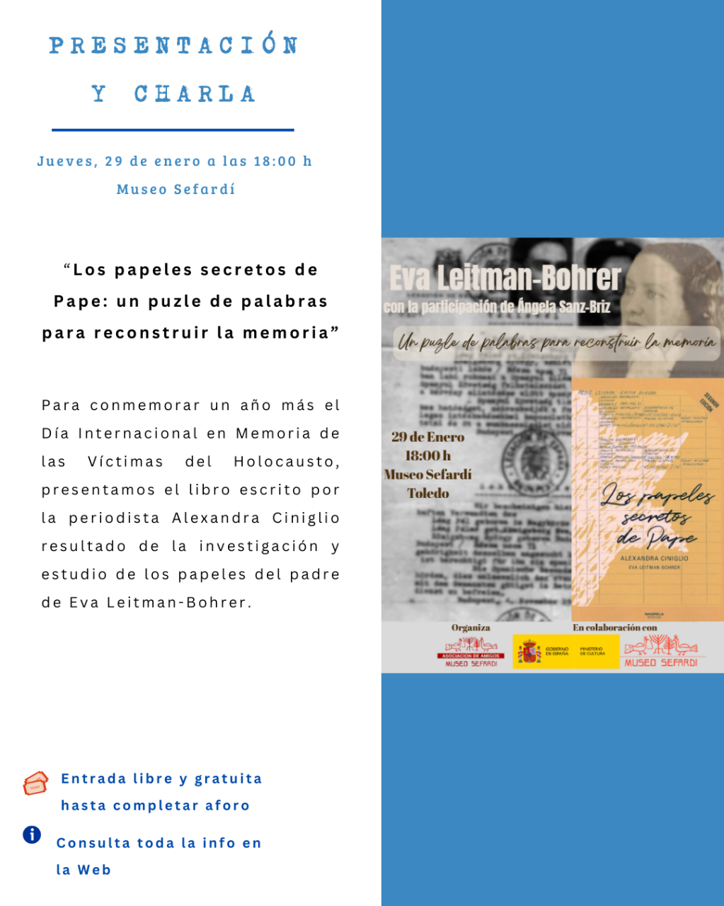 Localización Museo Sefardí C/ Samuel Leví, s/n45002 Toledo Museo estatal que conserva y transmite el legado hispanojudío y sefardí dependiente de la Subdirección General de Museos Estatales del Ministerio de Educación, Cultura y Deporte Categoría CharlaPresentación ir a la agenda Noticias Cultura Fecha lunes 29 Dic 2025 Finalizado! Hora 18:00 - 20:00 Presentación y charla | 'Los papeles secretos de Pape: un puzle de palabras para reconstruir la memoria' Compartir este evento + Añadir Google Calendar Exportación + iCal / Outlook El evento está terminado. Etiquetas: charla Toledo, museo sefardí, museo sefardí de toledo, presentación