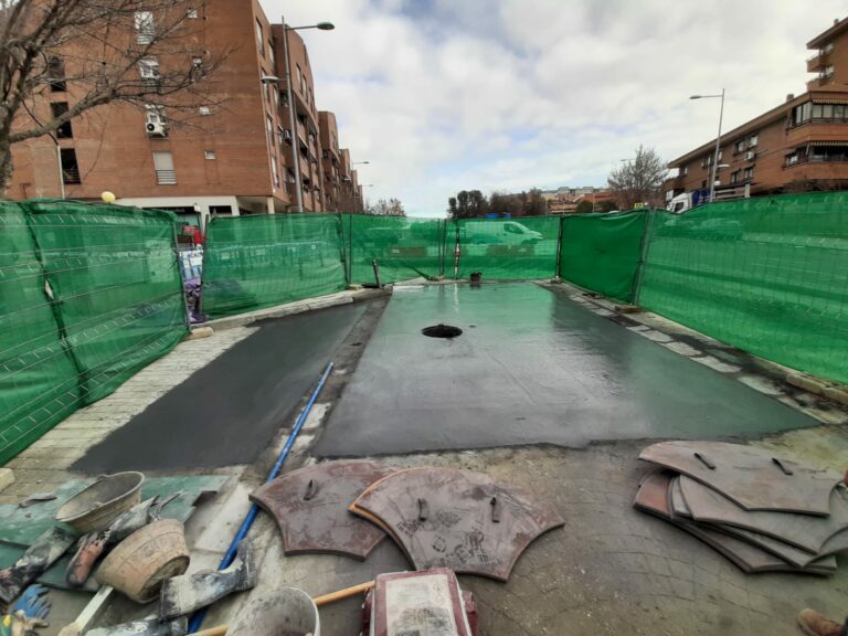 Posteriormente, las labores han proseguido con el relleno de tierras, la construcción de un forjado, la instalación de la losa de hormigón y la reposición del pavimento.