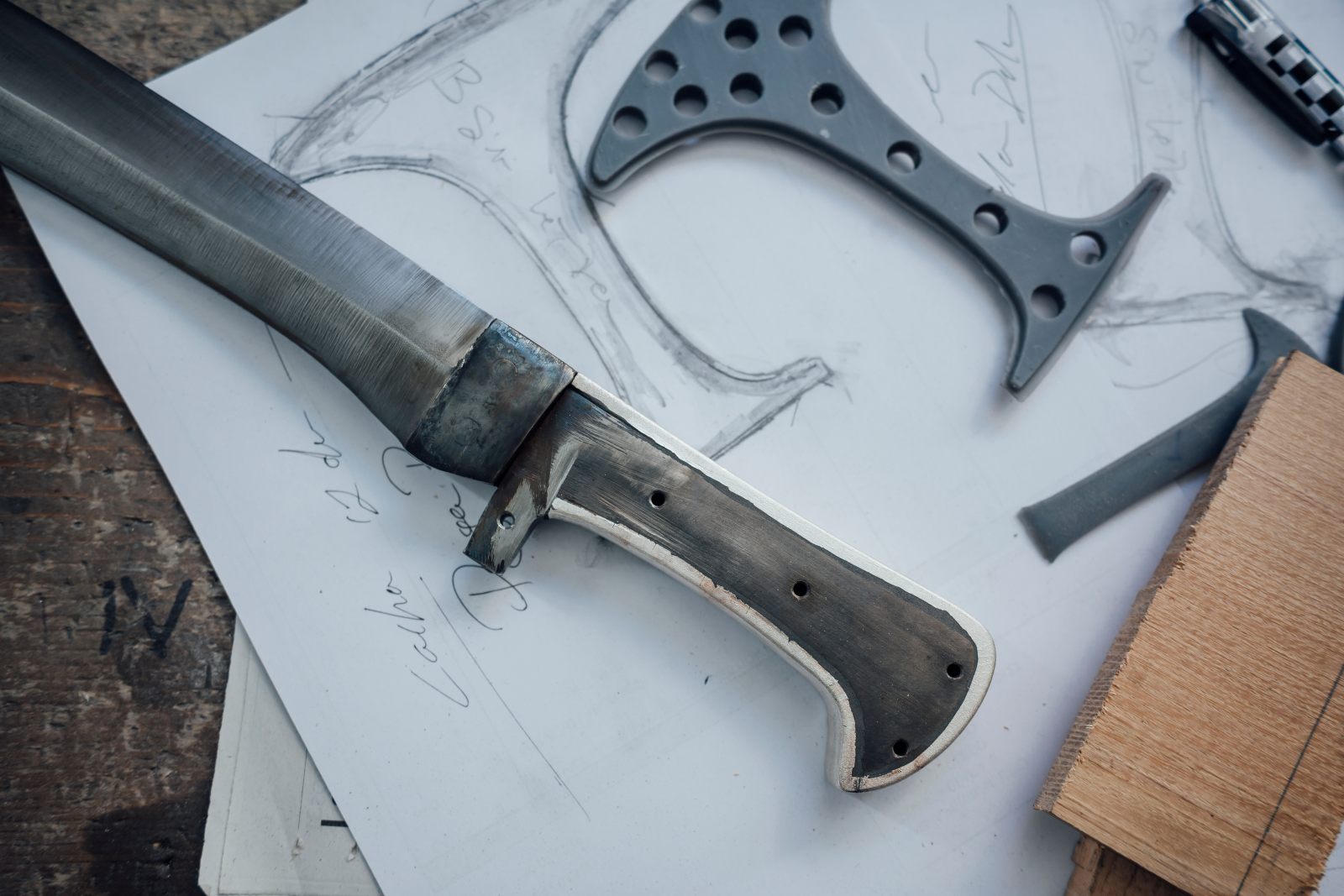 Para la elaboración de la espada de hierro se recurrió a Espadas Mariano Zamorano. El trabajo de este taller ha consistido en la elaboración de la hoja de una sola pieza, con virola e incrustaciones de plata en el borde externo de la empuñadura, según sus métodos artesanales propios y siguiendo las indicaciones arqueológicas respecto a las medidas y composición de la hoja, cuidando especialmente su volumetría y los vaciados para dotar la hoja de funcionalidad.