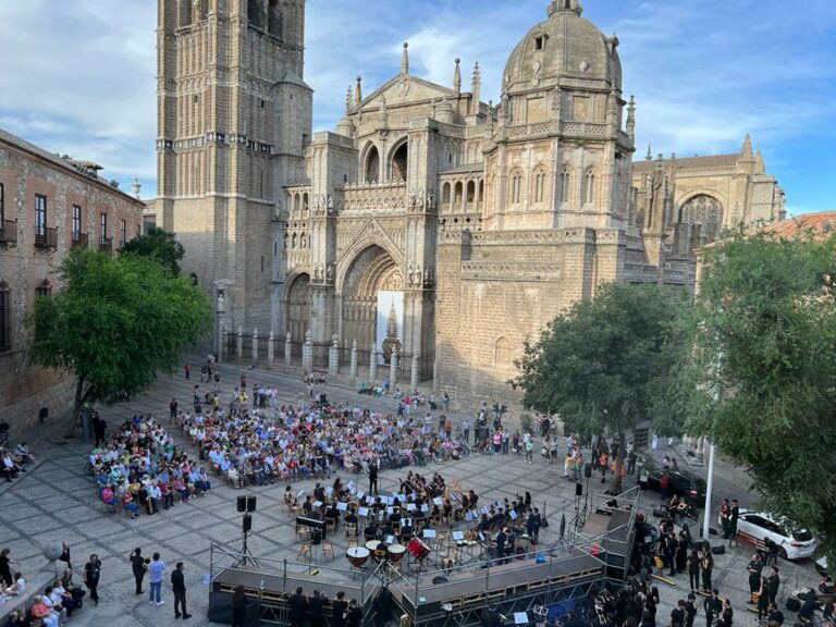La plaza del Ayuntamiento ha acogido el concierto conmemorativo del Día de Europa organizado por el Consistorio toledano y el Conservatorio Profesional de Música Jacinto Guerrero que ha recibido una gran acogida por parte del público. En él han participado las bandas y el coro que conforman esta entidad académica, además del coro toledano Jacinto Guerrero.