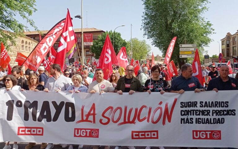 En Toledo, la marcha ha recorrido las calles desde la plaza de Toros hasta la plaza de Zocodover, encabezada por una pancarta con el lema ‘La solución: subir salarios, contener precios, más igualdad’. También han participado trabajadores y trabajadoras de Correos, colectivos en defensa de las pensiones, así como el PSOE, Izquierda Unida Castilla-La Mancha y el Partido Comunista. Los líderes regionales de CCOO y UGT, Paco de la Rosa y Luis Manuel Monforte, respectivamente, han querido primero referirse a los dos accidentes laborales mortales que se han producido este fin de semana en Castilla-La Mancha. Han calificado de “injustificable e insoportable” que se sigan produciendo estas muertes y han pedido más medidas concretas para garantizar el derecho a la salud también en el entorno laboral.