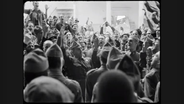 Los enviados especiales de la Hearst Metrotone News a la Guerra Civil grabaron cómo los generales Francisco Franco y José Enrique Varela, y el coronel José Moscardó, llegaban a las ruinas del Alcázar, asediado tras meses de combates entre el ejército sublevado y la defensa estatal. “El General Franco ha liderado a sus tropas hacia el rescate”, afirma el periodista que narra la noticia.
