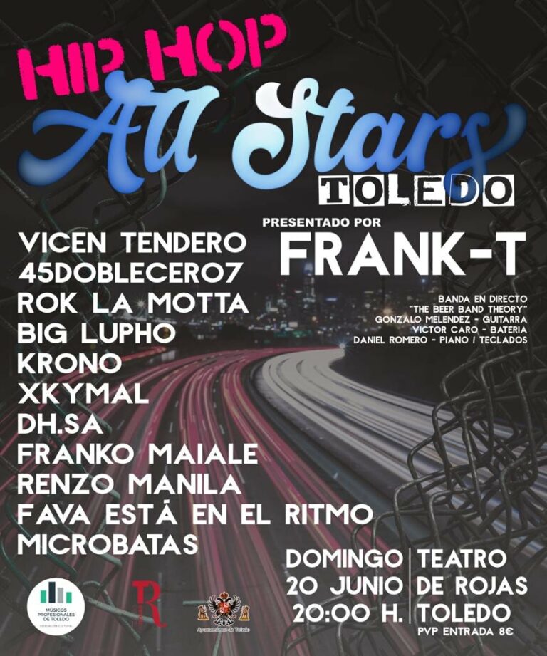 La Asociación de Músicos Profesionales de Toledo ha organizado 'Hip-Hop All Stars', una fiesta para reivindicar la música hecha en Toledo que contará con el conocido rapero Frank-T como maestro de ceremonias. Desde la organización afirman que será una noche "única e irrepetible", amenizada por la banda en directo 'The Beer Band Theory'. En el repaso a la escena urbana toledana se encuentran grupos como 45doblecero7, Vicen Tendero, Rok La Motta, Big Lupho, Krono, Xkymal, DH.SA, Franko Maiale, Renzo Manila, Fava está en el ritmo y Microbatas.
