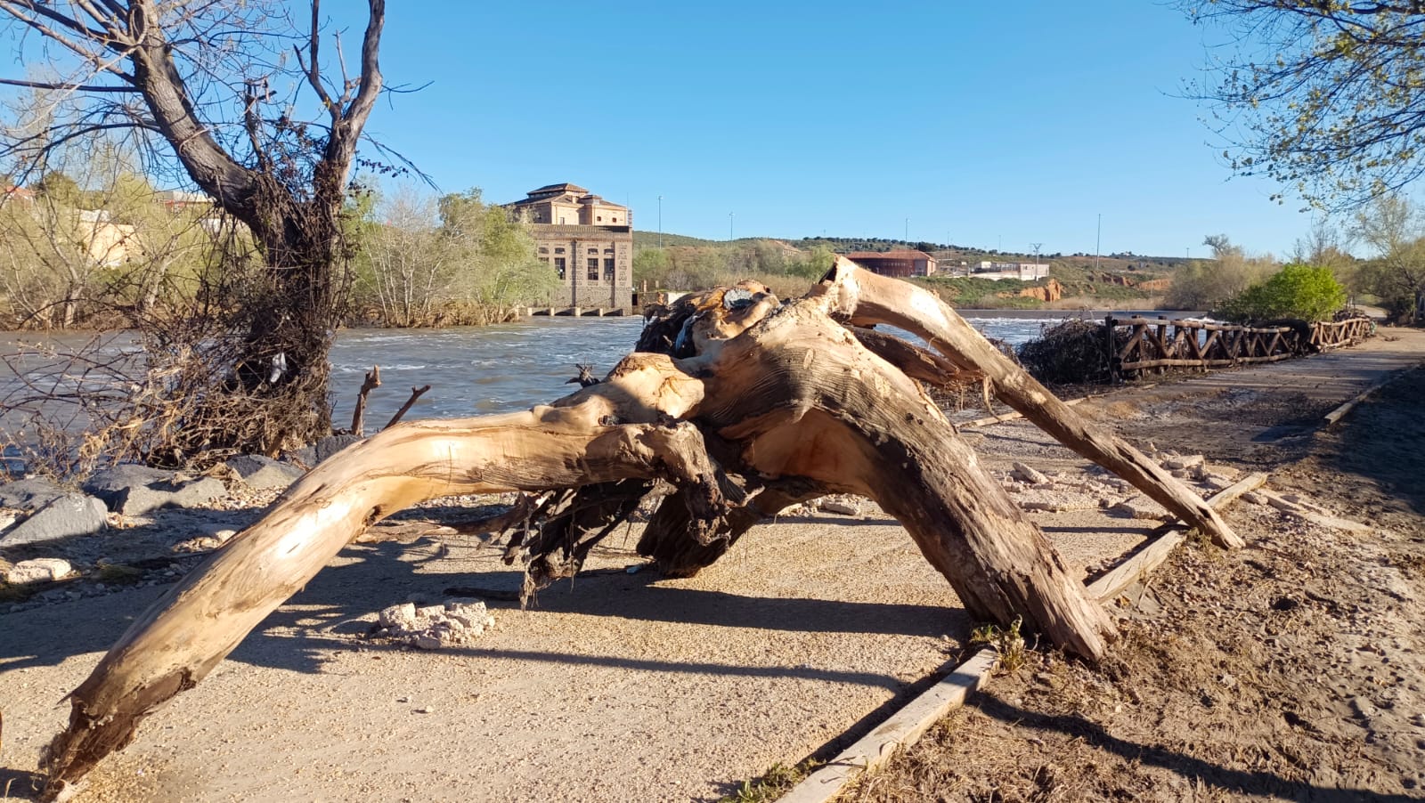 Entre las imágenes que deja la senda ecológica, que ha estado cortada en varios tramos anegados de agua por la crecida del río, impresiona un enorme resto de arbolado que abarca todo el ancho de la misma. Además, hay varias zonas en las que este sendero ligado al río ha sufrido destrozos y ha perdido parte de la tierra que lo compone.