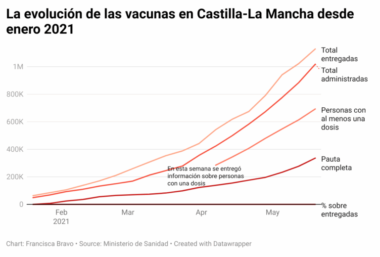 Eventos como la tormenta Filomena retrasaron la administración de vacunas , así como los múltiples retrasos por parte de las empresas farmacéuticas. Esta es la información que se ha facilitado de manera diaria, expuesta de manera semanal, por parte del Ministerio de Sanidad. Desde la última semana de marzo, el aumento de las vacunas administradas ha sido exponencial en Castilla-La Mancha: de una semana a otra se ha pasado de administrar unas 20.000 dosis, en las últimas semanas de enero, a finales de marzo se consiguió casi superar las 70.000 inoculaciones.