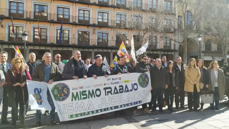 Dos decenas de guardias civiles y policías nacionales se han manifestado este viernes, 16 de febrero, frente a la sede toledana de la Delegación del Gobierno en Castilla-La Mancha, situada en la Plaza de Zocodover. Respondían así a una convocatoria nacional de la Plataforma por una Jubilación Digna y Equiparación Salarial, para reclamar dejar de ser tratados como si fueran de “segunda categoría”. Así lo explicaba el secretario general de Toledo de la Asociación Unificada de Guardias Civiles, Pablo Herrera. “Lamentablemente, el Gobierno nos trata así”, señalaba en declaraciones a elDiarioclm.es. La plataforma está integrada por asociaciones de guardias civiles y sindicatos de la Policía Nacional.
