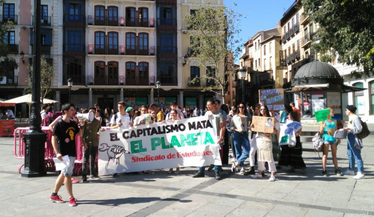 "¡Hasta los pulmones de tantas emisiones!, ¡Gobiernos culpables, sistema responsable!", han sido algunas de las reivindicaciones que se han podido escuchar en la plaza de Zocodover en la concentración promovida por el Sindicato de Estudiantes y en la que han participado universitarios, estudiantes de ESO o trabajadores.