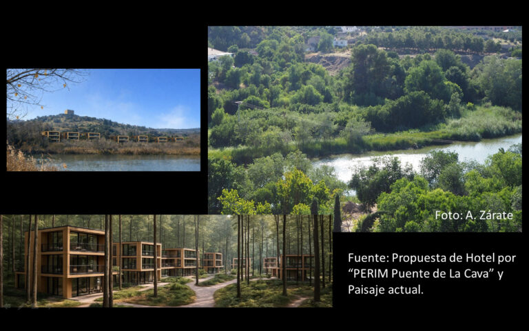 Por otro lado, la volumetría y la estética del conjunto no pasan desapercibidas, son incompatibles con los principios de “autenticidad”, “integridad” y “originalidad” exigidos por la UNESCO a Toledo para su inclusión en la lista del Patrimonio Mundial, y menos cuando las instalaciones hoteleras, de tres pisos y bloques separados, se levantarán a escasos metros de la muralla histórica, cerca de la torre albarrana del Baño de la Cava y del Puente de San Martín. ¿Se imagina el lector la armonía y coherencia paisajística de esas estructuras acristaladas de 3 pisos en uno de los entornos “verdes” y “azules” de más calidad de Toledo?, con la aguas del Tajo remansándose y ensanchándose a la salida del Torno, con la ermita del Cristo de la Luz en la orilla opuesta del río, cerca de las presas de antiguos molinos y de la Real Fábrica de Armas. Todo eso en un entorno que ha servido de motivo pictórico a Aureliano de Beruete, a Ignacio Zuloaga o Pablo Manzano y Arellano entre otros.