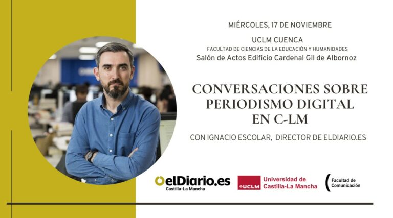 El próximo miércoles, día 17 de noviembre, el campus de Cuenca acogerá el encuentro "Conversaciones sobre periodismo digital en C-LM", organizado por elDiario.es de Castilla-La Mancha (elDiarioclm.es) y la Universidad de Castilla-La Mancha (UCLM). Se celebrará desde las 9.00 hasta las 14.00 horas en el Salón de Actos del Edificio Cardenal Gil de Albornoz de la Facultad de Ciencias de la Educación y Humanidades, y participarán periodistas, comunicadores, analistas y expertos en medios online. Entre ellos estará el director de elDiario.es, Ignacio Escolar.