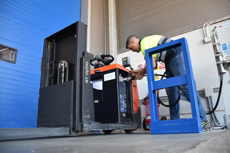 En principio, dispensará hidrógeno verde a una furgoneta destinada a la logística urbana y a las carretillas de este almacén. Se trata de las primeras carretillas para movimiento de mercancías que han sido transformadas para abastecerse con hidrógeno.