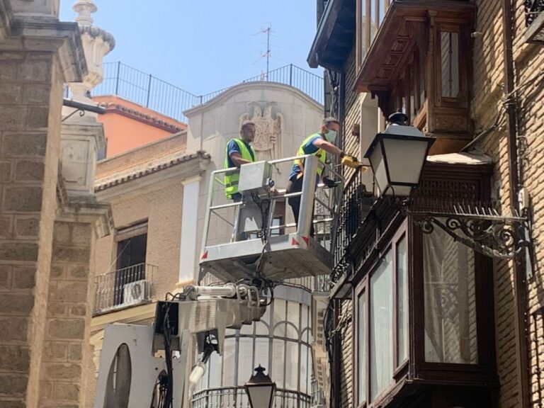 La empresa contratada por el Ayuntamiento de Toledo para controlar la población de palomas en la ciudad ha iniciado los trabajos en la calle Hombre de Palo para instalar "elementos pasivos" que eviten que las palomas aniden y se posen en determinados elementos del mobiliario urbano del Casco Histórico.