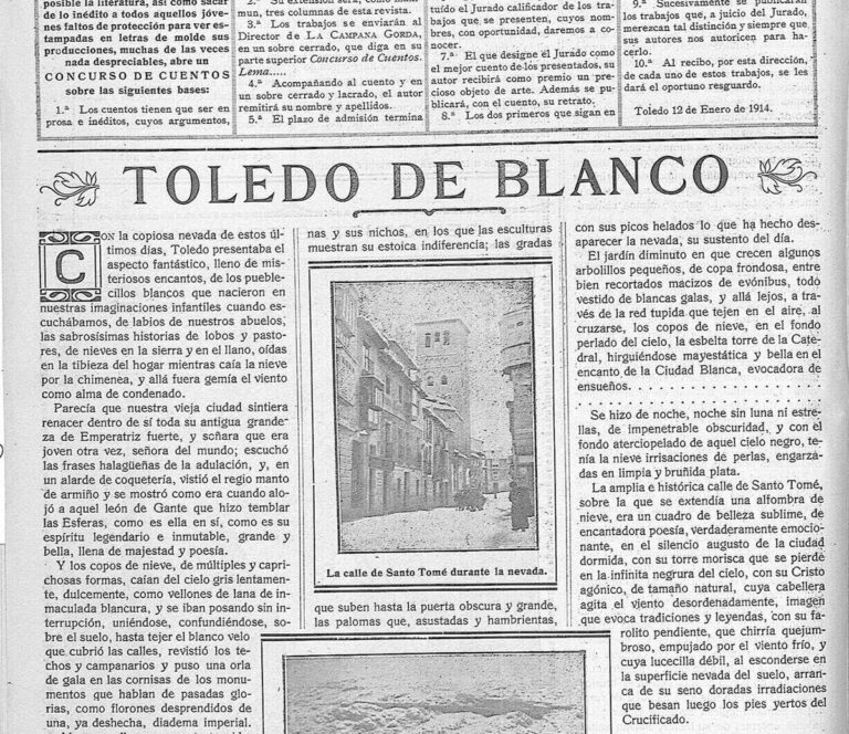 “Toledo de blanco” es el titular que elegía el diario La Campana Gorda el 25 de enero de 1914 para publicar cómo había afectado el temporal. Así puede verse en el post de la Biblioteca regional gracias al catálogo de la Biblioteca Virtual de Prensa Histórica, dependiente del Ministerio de Cultura.
