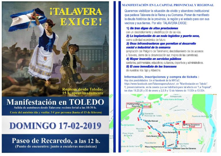 La Mesa por la Recuperación de Talavera y su Comarca se manifiesta este domingo, 17 de febrero, en la capital regional acompañada de otras plataformas ciudadanas que apoyarán las reivindicaciones que exigen a las administraciones para esta ciudad con "un sentimiento desabrido de abandono y olvido".