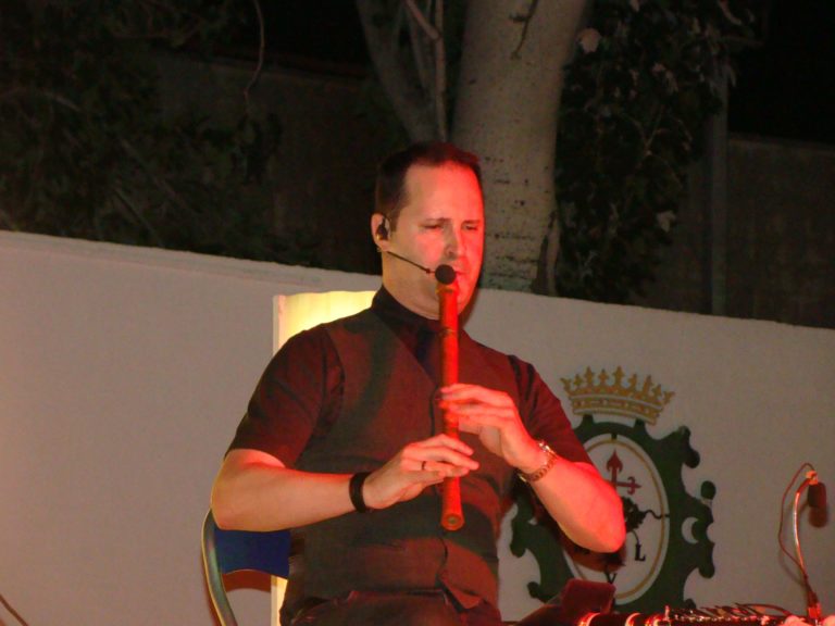 La Banda ha iniciado el concierto con uno de los temas de su primer trabajo “Peregrinatio” y en cada tema, Fernando Mosquera iba presentando los diferentes instrumentos que ha tocado. Además, también ha subido al escenario con la flauta travesera para hacer una colaboración con la Banda, un músico quintanareño, Enrique Fuentes.