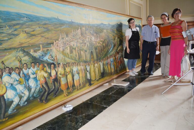 La Diputación de Toledo está llevando a cabo trabajos de restauración en el cuadro 'Toledo símbolo', de Cecilio Mariano Guerrero Malagón, que preside el Salón de Plenos de la Institución y que fue dañado por la DANA del pasado mes de septiembre.