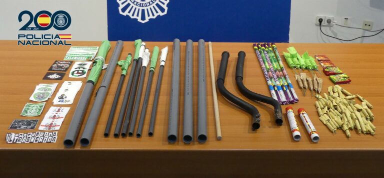Durante el registro realizado a los radicales del Cacereño se levantaron varias actas y se incautaron palos, barras metálicas, bengalas, material pirotécnico y pegatinas ofensivas, mientras que en la identificación de sus rivales se aprehendió arma blanca y se expulsó del estadio tras intentar acceder indebidamente a la zona destinada a la afición visitante.