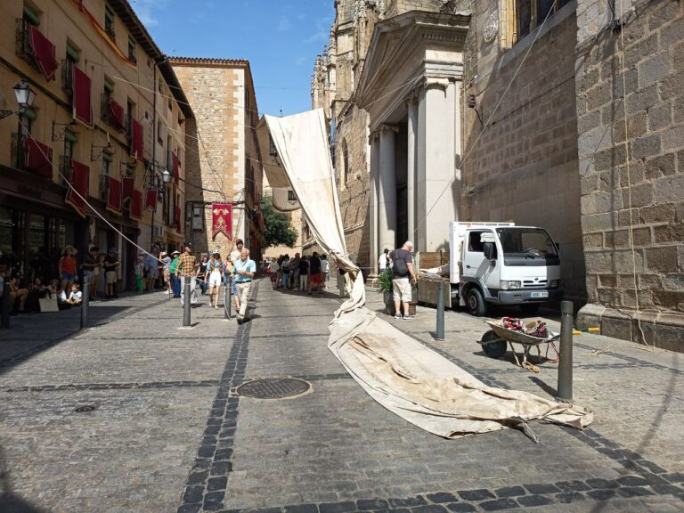 Las fuertes rachas de viento vividas en la noche de este pasado lunes 16 de junio provocaron la caída de algunos de los históricos toldos dispuestos a lo largo del recorrido que seguirá la procesión del Corpus Christi este jueves en Toledo. Los más afectados, según confirman fuentes municipales, fueron los del entorno de la calle Trinidad y Alfonso X.