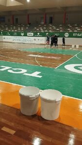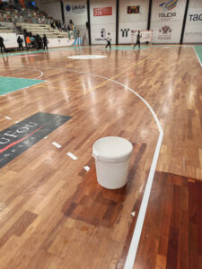 - Cubos en el pabellón Javier Lozano por las goteras / Imagen: PSOE Toledo