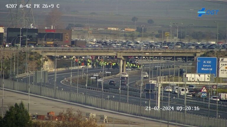 Los agricultores han cortado la A-42, en sentido Toledo, en el kilómetro 26 de esta vía coincidiendo con las protestas agrarias. La acción que no había sido anunciada, coincide con las cinco columnas de tractores que se dirigen hoy hacia la capital de España.