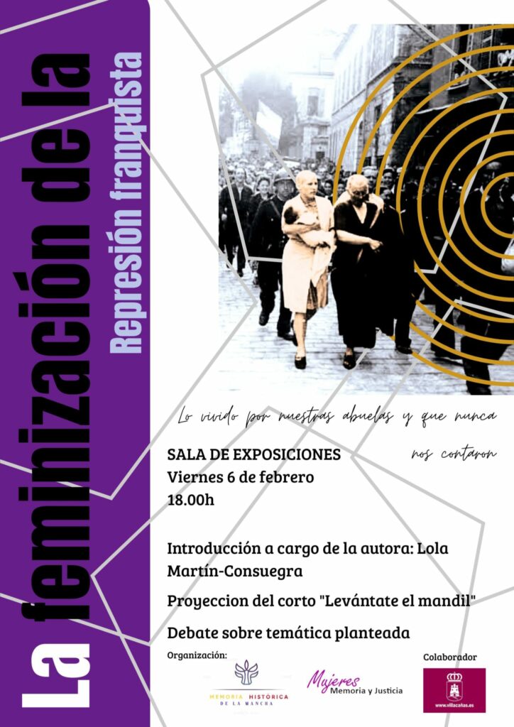 El grupo de Memoria Histórica de La Mancha organiza el próximo viernes 6 de febrero, a las 18:00 horas, en la Sala de Exposiciones de Villacañas, una jornada centrada en la feminización de la represión franquista, que incluirá la proyección del cortometraje documental 'Levántate el mandil' y un posterior coloquio abierto al público.