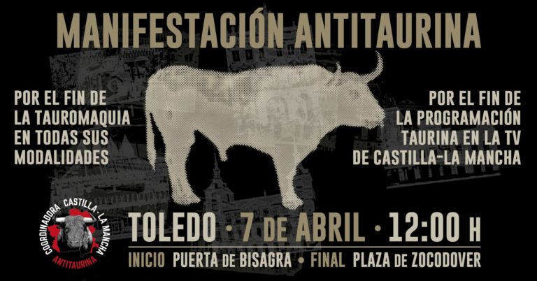 La Coordinadora Antitaurina de Castilla-La Mancha ha convocado una manifestación este domingo, 7 de abril, en Toledo que saldrá de la puerta de Bisagra a las 12 horas para llegar a Zocodover donde se celebrará una 'concentración-performance'.