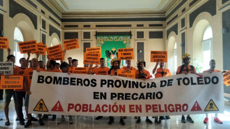 Los bomberos del Consorcio Provincial de Toledo han protagonizado hoy una sonora protesta en la Diputación momentos antes del inicio del Pleno previsto para este viernes, que se ha visto retrasado por la movilización.