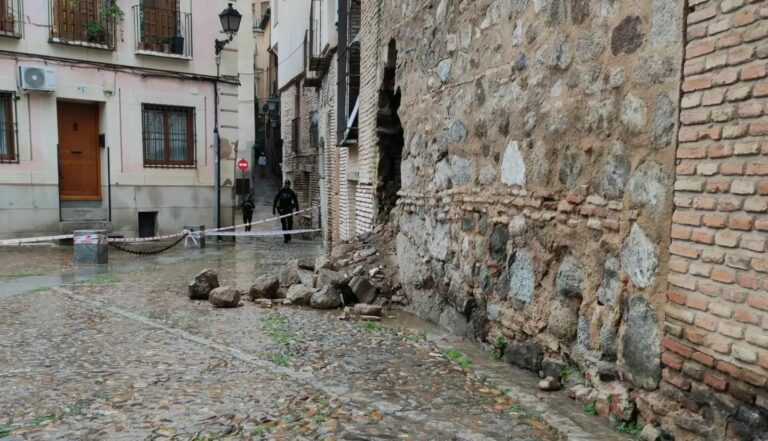 Se ha acordonado la zona y se han retirado los escombros que han caído a la calzada en un día protagonizado por intensas lluvias que podrían haber provocado el derrumbe de este muro.