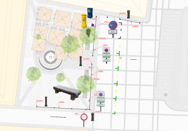 Es por ello que en la calle Sixto Ramón Parro se habilitarán dos plazas para carga y descarga, "servicio necesario en la zona debido a las actividades de las inmediaciones". El resto del entorno de la plaza se cerrará con mobiliario urbano, jardineras, pérgolas y aparcabicis, para que "no pueda colonizarse con el vehículo".