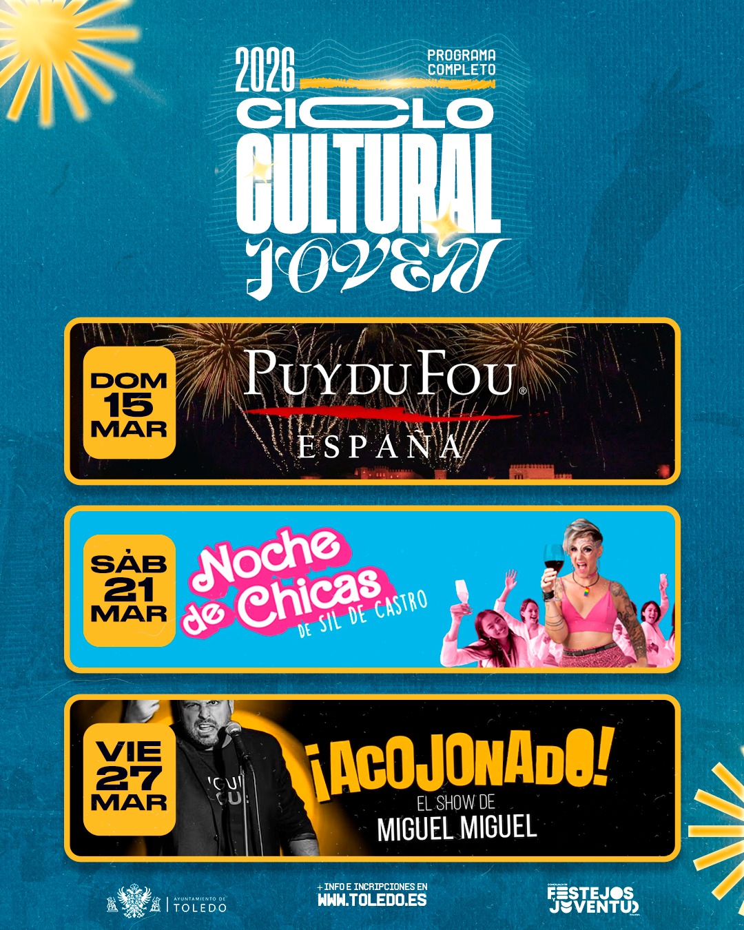 Ya en el mes de marzo, el viernes 6 los jóvenes podrán apuntarse para ir a ver la obra de teatro 'Los Miserables' en Madrid; el sábado 7 de marzo actuará la humorista 'Susi Caramelo' también en la Sala Thalía y el sábado 14 se celebrará el espectáculo de comedia 'Monólogos All Star', una propuesta que según García-Toledano, "ya tuvo gran acogida en ediciones anteriores y que este año contará con nuevos monologuistas". Además, el domingo 15 de marzo, se realizará una visita a Puy du Fou, "para acercar la cultura a nuestros jóvenes".