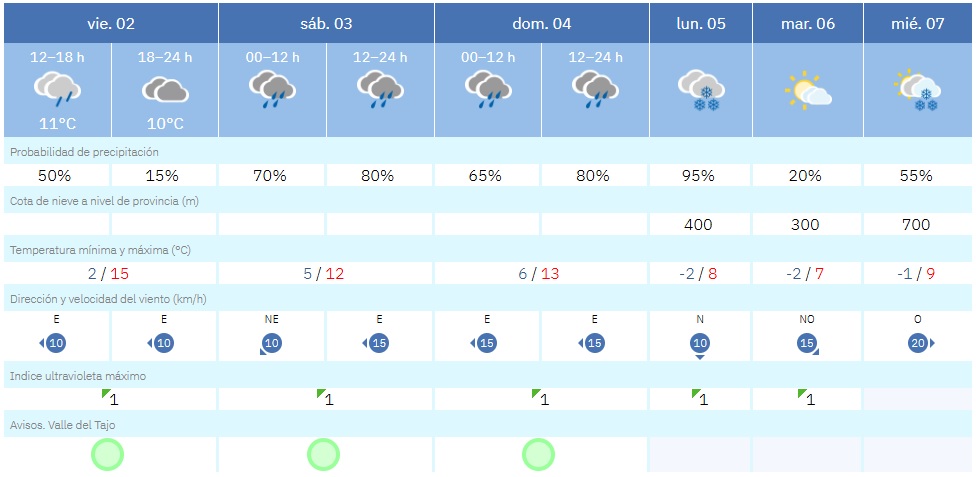En líneas generales, las temperaturas subirán salvo en el sureste de la Península y en el extremo norte. En concreto, para este fin de semana se prevén mínimas de entre 5 y 6ºC en Toledo y máximas de 12 o 13ºC, mientras que el lunes 5 el mercurio bajará hasta -2ºC.