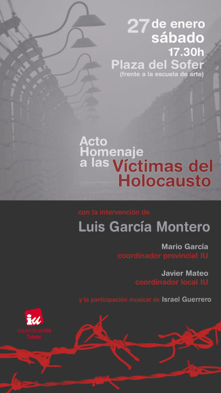 La plaza de Sofer, frente a la Escuela de Arte de Toledo, será el espacio donde tendrá lugar el homenaje toledano –organizado por IU a las 17.30 horas- con motivo de la celebración del Día Internacional en memoria de las víctimas del Holocausto. En él, estará el poeta Luis García Montero, que ha querido unirse a un reconocimiento que en honor a aquellas personas que sufrieron la deportación y la muerte en los campos de concentración, “toledanos que solo por defender sus ideales de liberad sufrieron el horror nazi en Mauthausen o Gusen”.