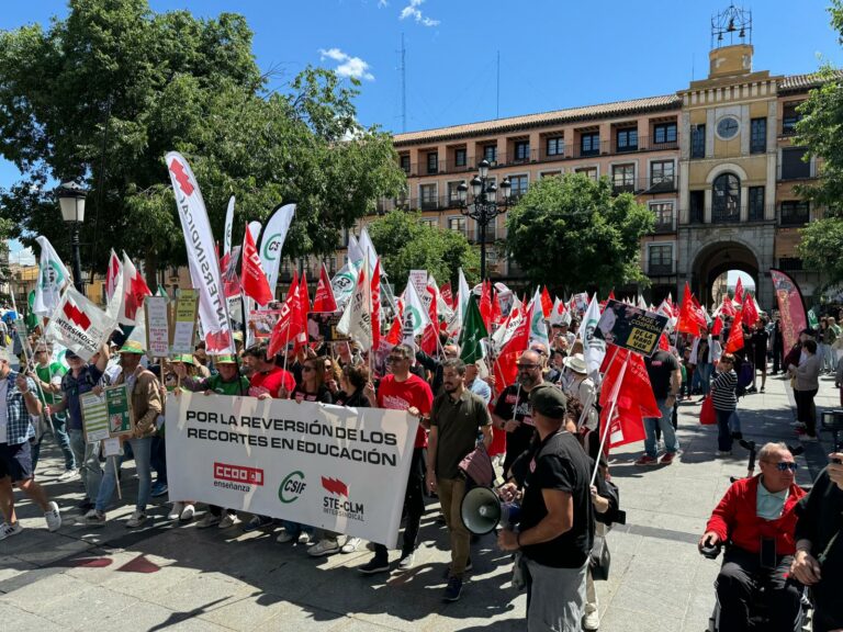 Cientos de profesores y profesoras procedentes de toda Castilla-La Mancha se han manifestado hoy por las calles del Casco Histórico de Toledo contra los "recortes estructurales" que, según sostienen, mantiene el Gobierno de Emiliano García-Page. La movilización, convocada por el STE, CCOO y CSIF, ha transcurrido desde la céntrica Plaza de Zocodover hasta el Palacio de Fuensalida, sede del Ejecutivo autonómico. Su lema: "Por la reversión de los recortes en educación".