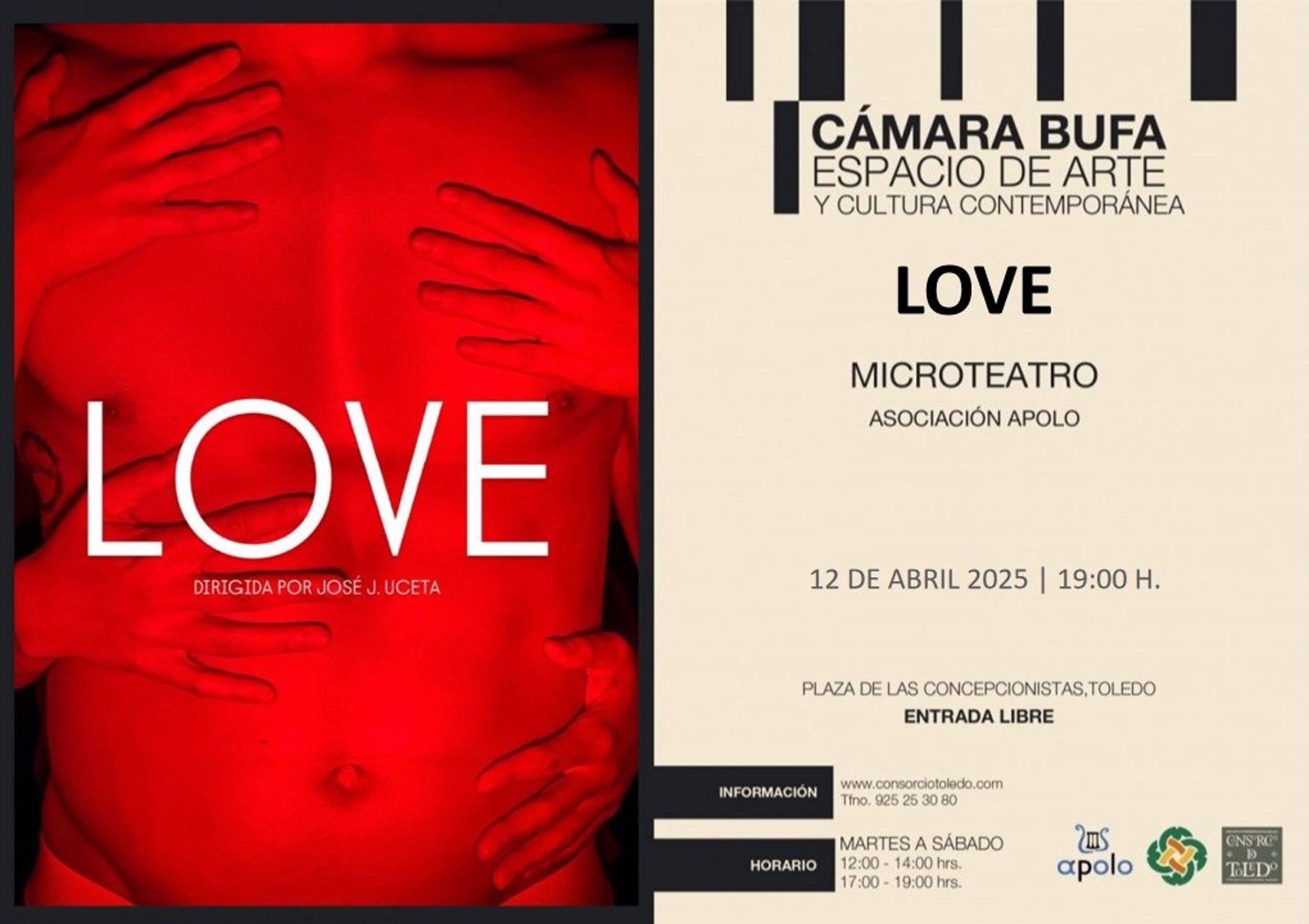 El sábado 12 de abril, a las 19.00 horas, la Cámara Bufa será escenario de la obra de microteatro 'Love', dirigida por José Julián Uceta. 'Love' narra una historia en forma de drama sobre la adicción y sus efectos, y la confusión entre amor y deseo. La micro pieza teatral es inmersiva, busca el contacto cercano con los espectadores y tiene una duración total de 15 minutos.