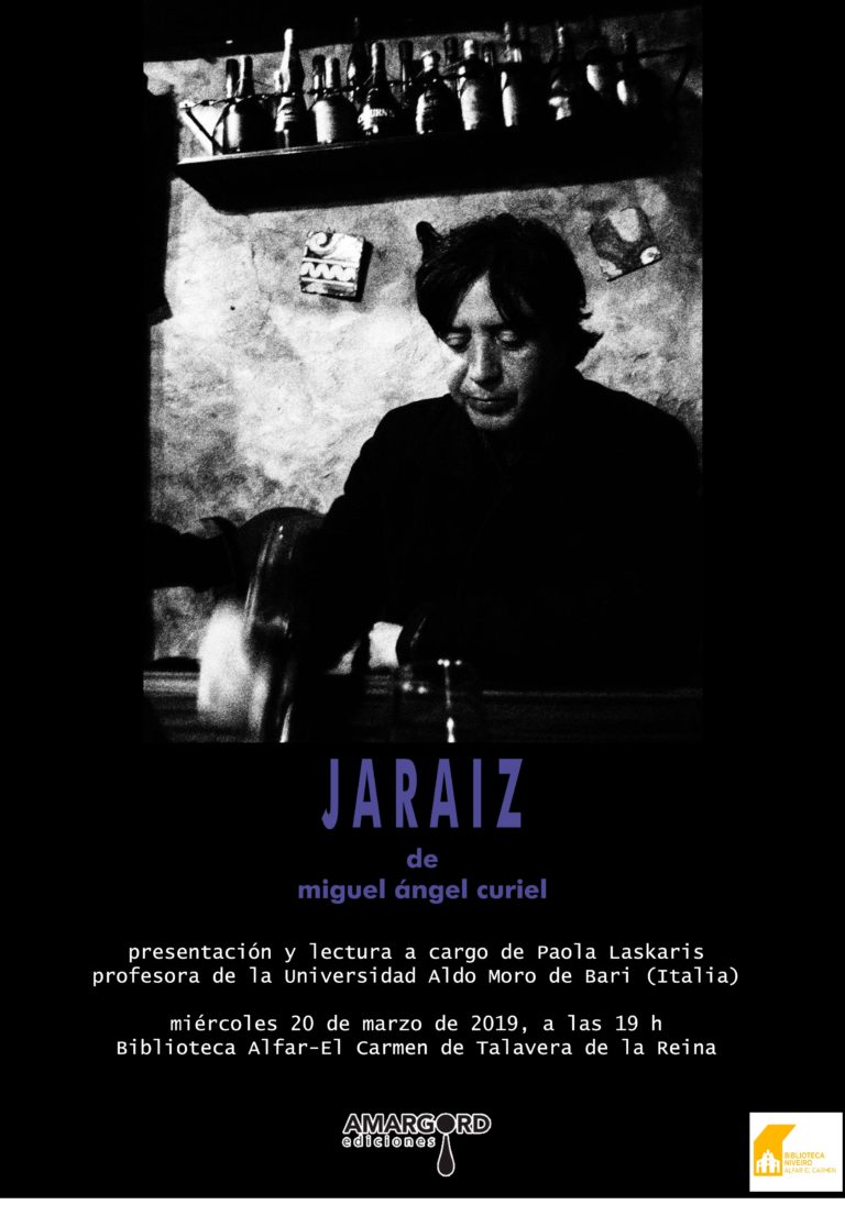 El escritor Miguel Ángel Curiel presentará en Talavera de la Reina el próximo miércoles, 20 de marzo a las 19.00 horas, 'Jaraíz' (Amargord ediciones, 2018), un nuevo poemario en el que se combinan dimensión mítica y narratividad lírica.