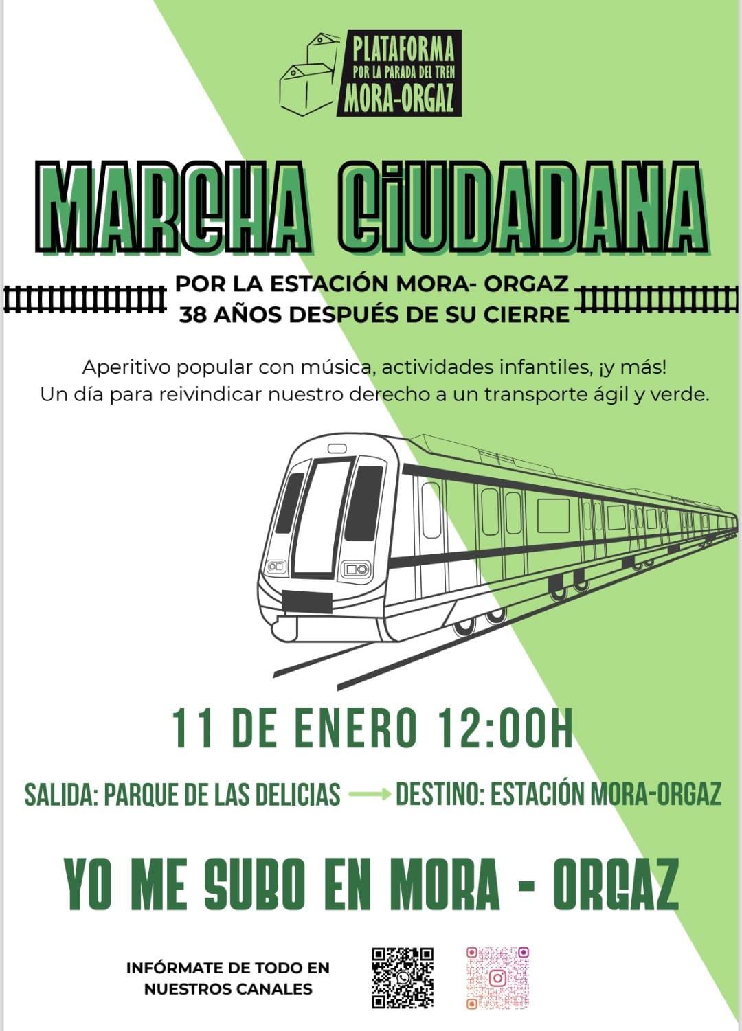 La Plataforma por la Parada del Tren Mora-Orgaz ha convocado una marcha ciudadana el próximo 11 de enero a las 12:00 horas para reivindicar la reapertura de la estación ferroviaria Mora-Orgaz, cerrada hace ya 38 años, y reclamar "un transporte público ágil, sostenible y justo para la comarca".