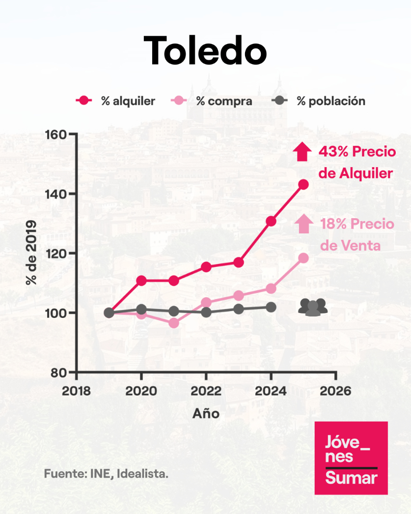 Una comparación “ilustrativa” a juicio de Movimiento Sumar es Talavera e Illescas. Según sus datos, en la primera ciudad, el número de habitantes no ha variado, mientras que en la segunda ha crecido un 11%. “Sin embargo, el precio del alquiler en Talavera se ha incrementado más de un 60% y en Illescas un 50%”.
