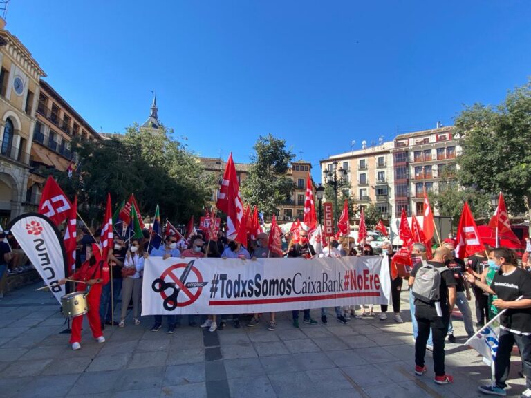 Cerca de 200 trabajadores se han concentrado este martes en la plaza de Zocodover de Toledo para volver a pedir un Expediente de Regulación de Empleo (ERE) "razonable" en Caixabank en el que no haya "salidas forzosas", a horas de que expire el plazo que tienen CaixaBank y sindicatos para llegar a un acuerdo sobre el ERE planteado en la entidad financiera y coincidiendo con una nueva jornada de huelga.