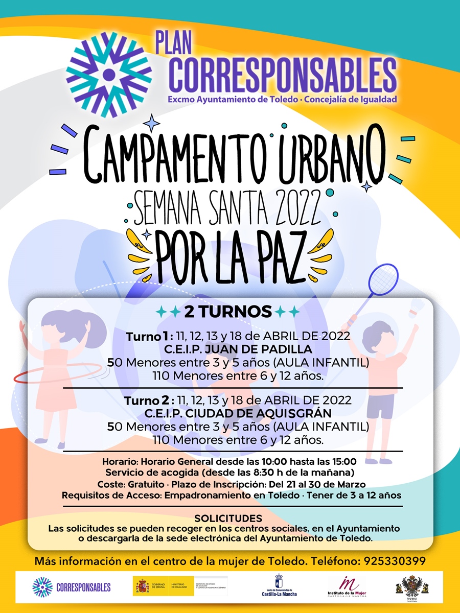Gracias al Plan Corresponsables del Ministerio de Igualdad, los padres y madres de la ciudad de Toledo contarán con un recurso para compatibilizar su trabajo con las vacaciones escolares de sus peques durante Semana Santa. Se trata del nuevo campamento urbano organizado por el Ayuntamiento de Toledo para los días festivos del 11, 12, 13 y 18 de abril. Se trata del primer recurso para la conciliación de la Concejalía de Servicios Sociales.