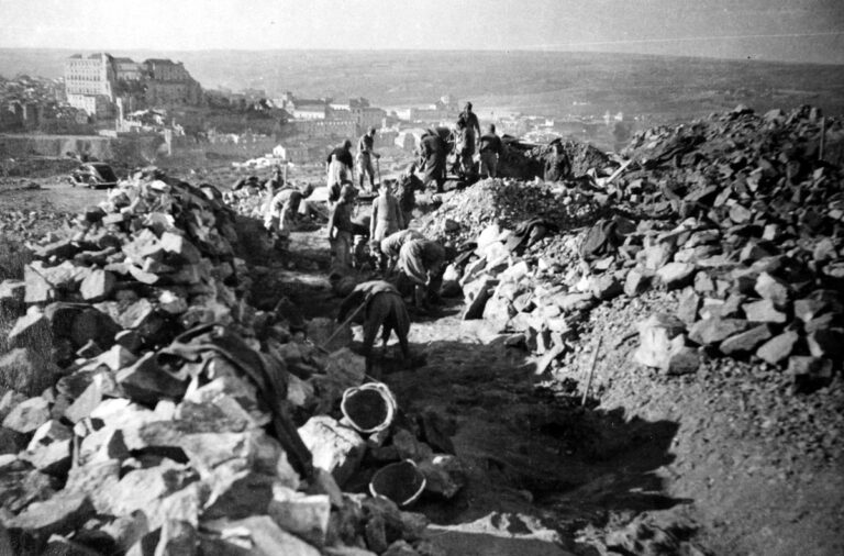 Como Higinio, fueron miles los presos trasladados a Toledo desde de toda España para participar en los trabajos de estas dependencias militares. Aquí estuvieron hasta finales de los años cuarenta. A pico y pala desmocharon los cerros que componían el barrio de San Blas, que se extendía desde el castillo de San Servando hasta las cercanías del Arroyo de la Degollada. Con poca más ayuda que su fuerza física, allanaron esos terrenos, acarrearon miles de toneladas de piedras, cimentaron y levantaron los edificios de la nueva Academia.