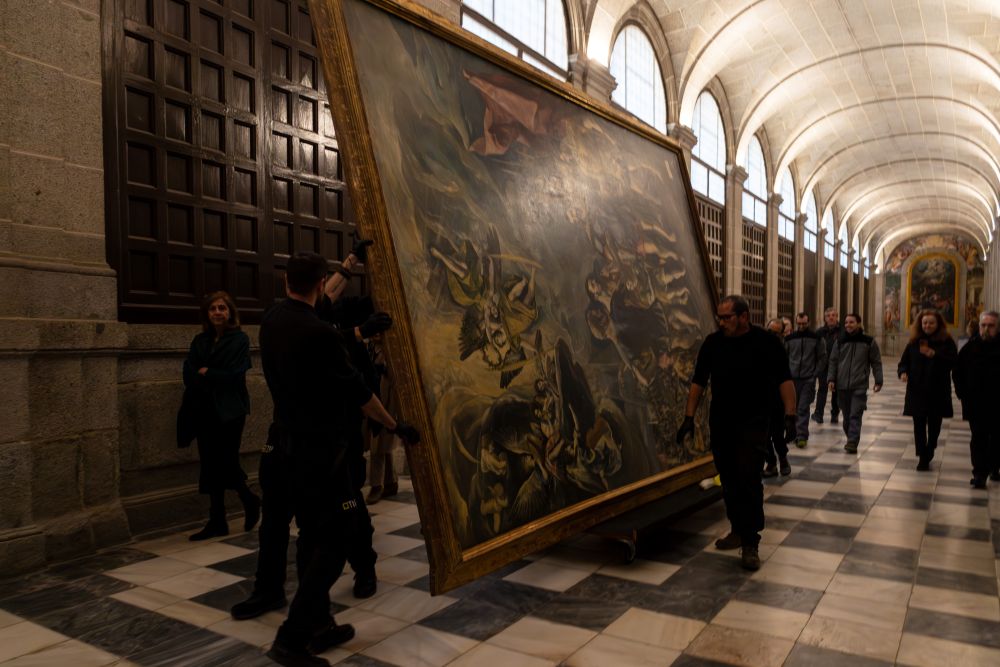 Patrimonio Nacional emprende la restauración de la obra maestra 'El Martirio de San Mauricio y la Legión Tebana', de El Greco. Esta semana se ha completado el traslado de la pintura desde las Salas Capitulares del Monasterio de San Lorenzo de El Escorial hasta la Galería de las Colecciones Reales, donde se realizará la intervención durante los próximos meses. Después, el cuadro se expondrá allí temporalmente antes de regresar al Real Monasterio.