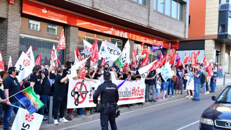 La concentración de Toledo se suma a las celebradas en otras muchas capitales de España, convocadas por todos los sindicatos con representación en Caixabank, para expresar el rechazo unánime al proceso de reestructuración planteado que tramita un ERE para recortar 8.291 empleos (el 18,67% de la plantilla) y quiere cerrar el 27% de sus oficinas en España.