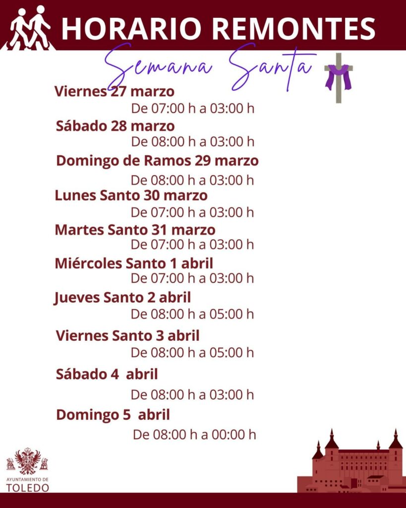 Por último, para facilitar el acceso al Casco Histórico los remontes mecánicos de Recaredo y el Miradero ampliarán su horario de funcionamiento, del 27 de marzo al 1 de abril estarán abiertas hasta las 03.00 horas de la madrugada; el Jueves y Viernes Santo, lo harán hasta las 05.00 horas de la madrugada; mientras que el Sábado abrirán hasta las 03.00 horas de la madrugada.