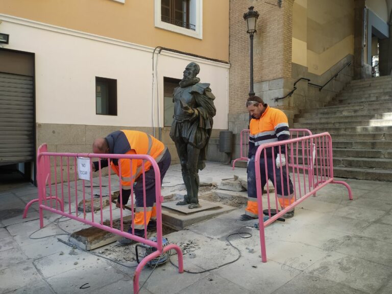 Operarios municipales han procedido este lunes a retirar la estatua de Cervantes que se sitúa bajo las escaleras del Arco de la Sangre, en el Casco Histórico de Toledo, para fortalecer sus anclajes y consolidar la misma ante el riesgo de que se cayera.